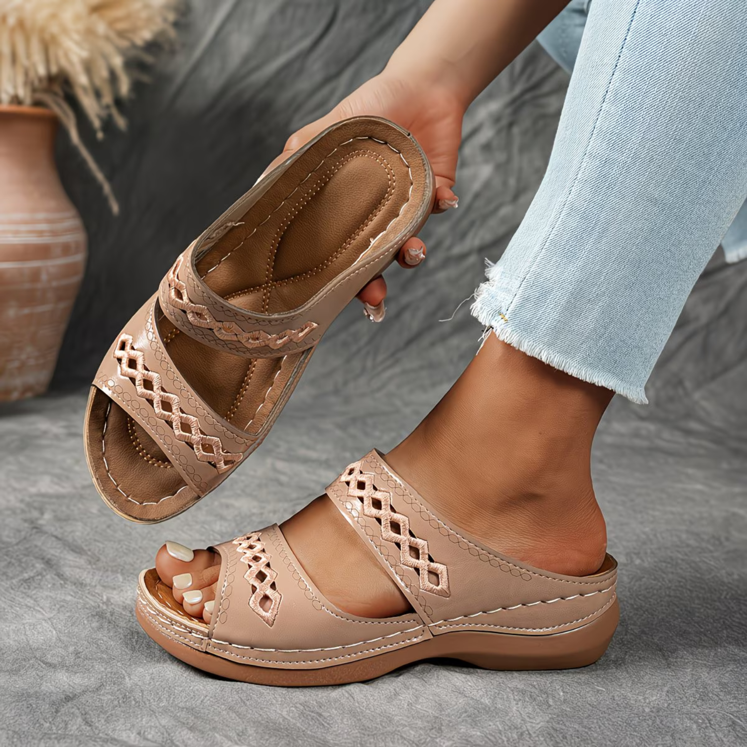 Simply, slip them on and snug your feet in place around the toe clasp for enhanced support.